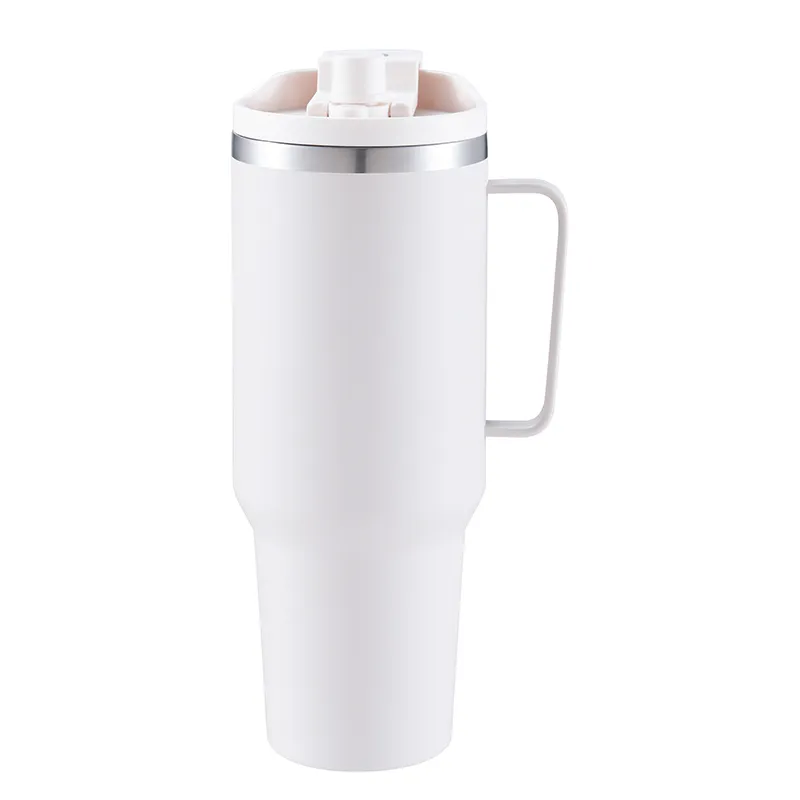 The insulated large stainless steel coffee tumbler with white handle and flip-top lid balances thermal retention, ergonomic handling, and sleek design. Double-wall insulation, leak-resistant flip-top lid, and ergonomic handle make it suitable for commuting, office use, outdoor activities, and corporate gifting. Controlled manufacturing processes, including vacuum creation, wall uniformity, and ergonomic testing, ensure consistent product quality. For B2B buyers, this tumbler offers a combination of performance, durability, and customization potential.